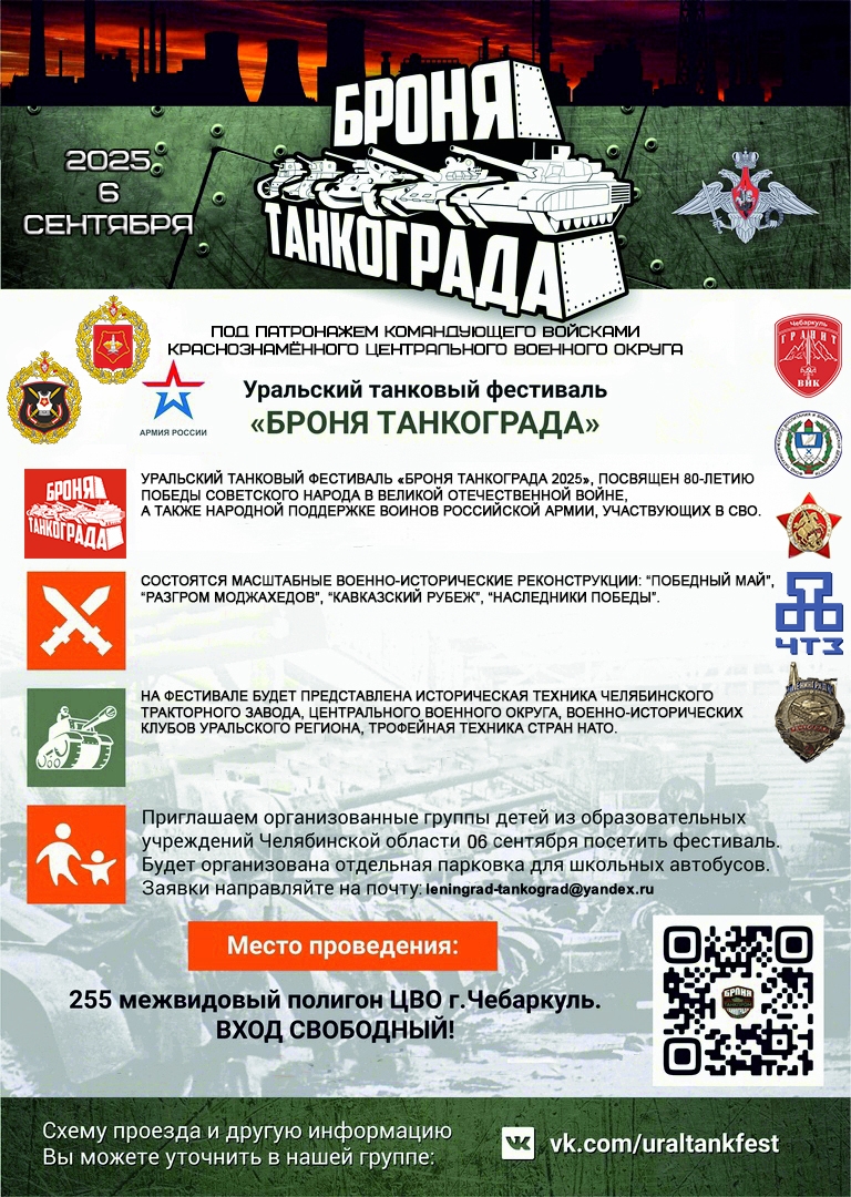 Приглашаем Вас на ежегодный, шестой Уральский Танковый Фестиваль "БРОНЯ ТАНКОГРАДА - 2025", который будет проходить 6 сентября 2025 года, на 255 межвидовом полигоне ЦВО, г. Чебаркуль.